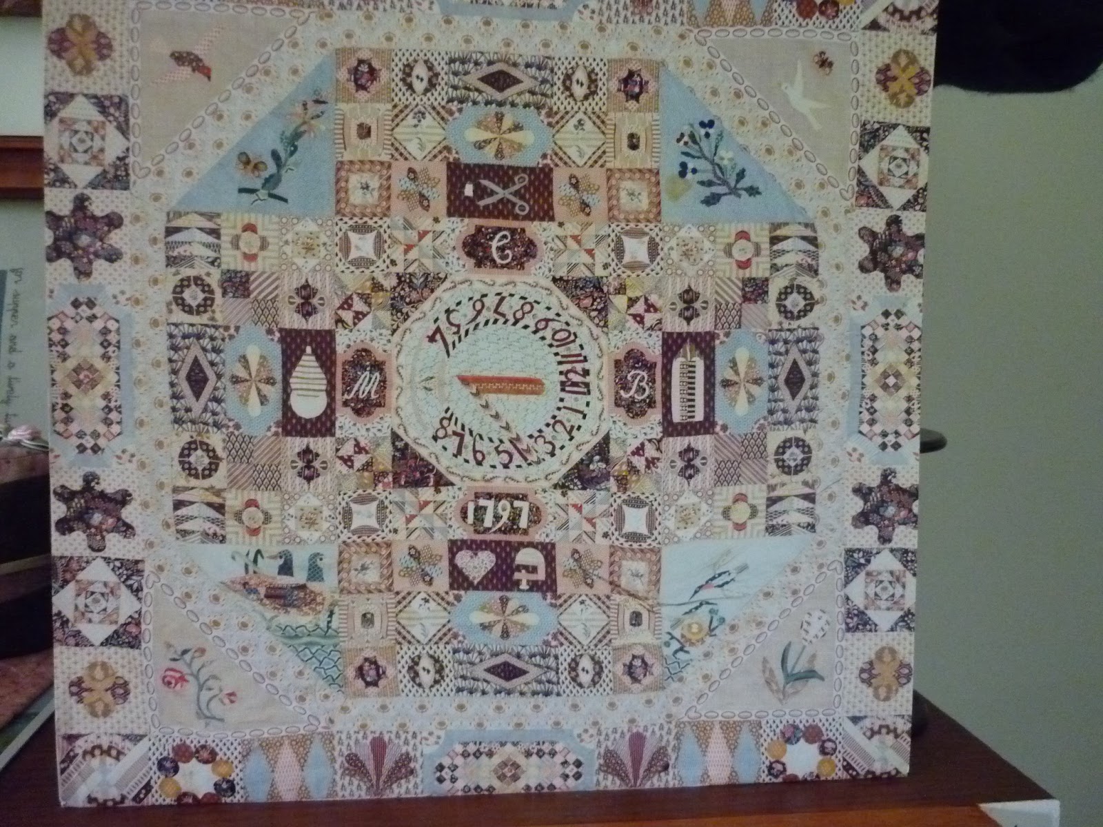 When one of my friends returned from London and the V & A quilt show she gave me this postcard of the Sundial Quilt. It has been sitting on view in my craft room ever since. I just love the colours that were used to make it and all the small designs.